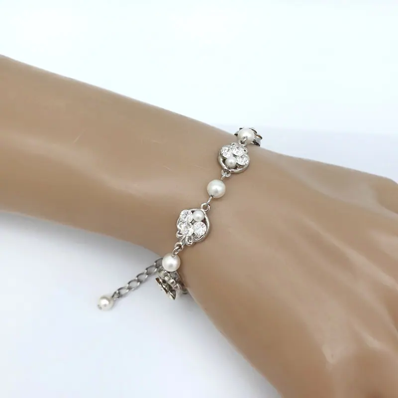 As part of our bespoke range you have the flexibility to make changes to suit your style. Either order this bracelet ‘as photographed’ or ‘customise’. You can change crystal or pearl colours with the plating colour of your choice – silver, gold or rose gold. If you wish to change the length of this bracelet, we can also arrange that for you. Each piece is handmade for each customer and customising usually takes 3-4 weeks. We try to keep this photographed version in stock as much as possible to save customer delays. This bracelet is photographed with clear crystals and white pearls on a silver setting.