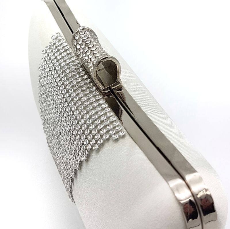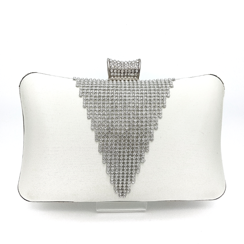 Gorgeous and stylish, the perfect combination for those little essentials. Made from soft ivory satin with a stunning diamante triangular feature and clasp. Comes with 2 attachable straps of 33.5cm and 121cm.