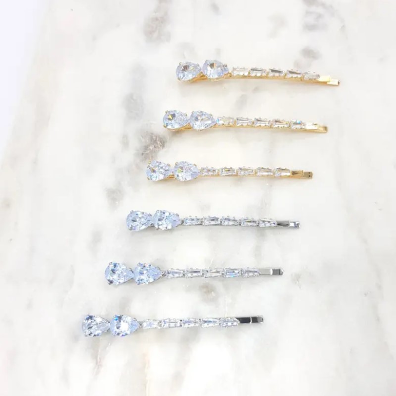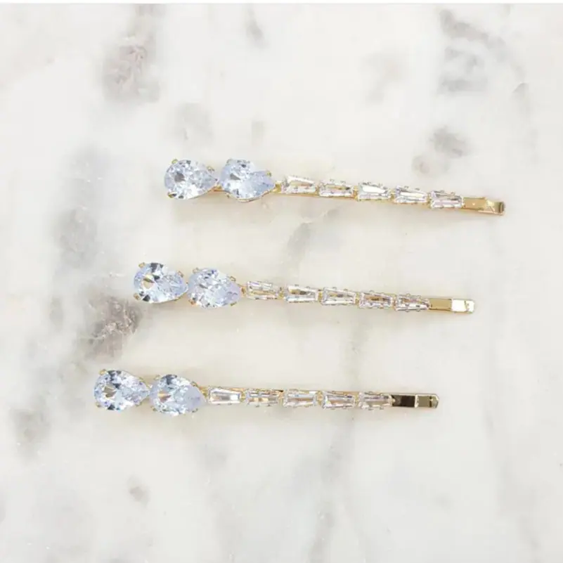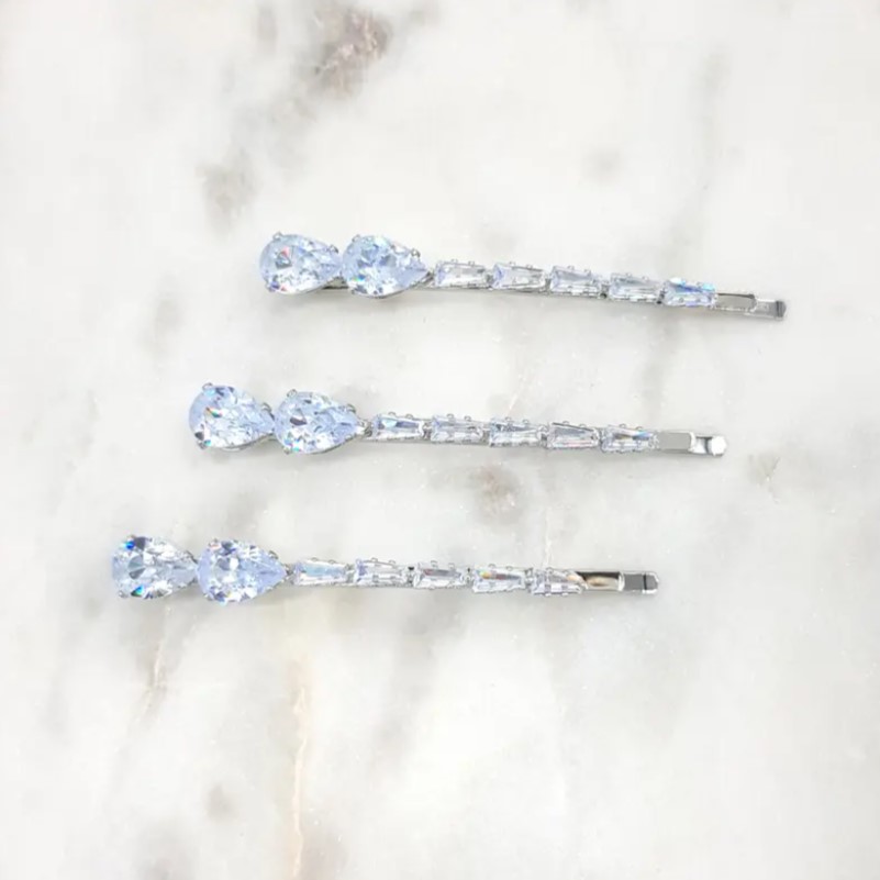 Stunning cz hair slides or pins. Made from quality tear shaped and tapered cubic zirconia with your choice of either rhodium silver or gold plating. Sold as a set of 3. Nickel free.