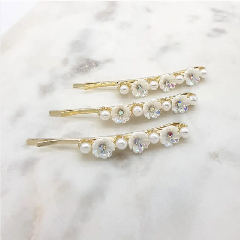 Cute gold plated floral and pearl hair slides. Sold as a set of 3 and made with pearlised flowers with crystal centres and separated with faux pearls.