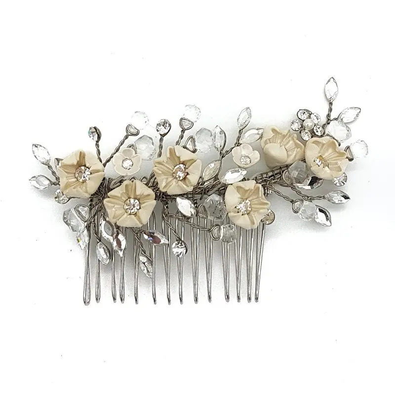 This stunning ivory pearl blossom comb pays homage to the delicate floral pieces of the 20’s and 30’s. It features gorgeous crystal detailing even down to the flower centres. A truly special piece. Also available is a large ‘Marsha’ hair comb with matching ‘Marshana’ earrings, ‘Marshana’ Necklace, and ‘Marshana’ Bracelet. Co-ordinate this gorgeous collection as you desire.