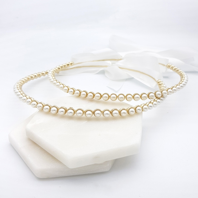 A touch of elegance for your traditional Greek wedding ceremony. Our ‘Ophelia’ stefana are handcrafted with 8mm ivory pearls. This set of 2 are connected by 1.5mtrs of soft ivory satin ribbon and available in your choice of silver or champagne gold.