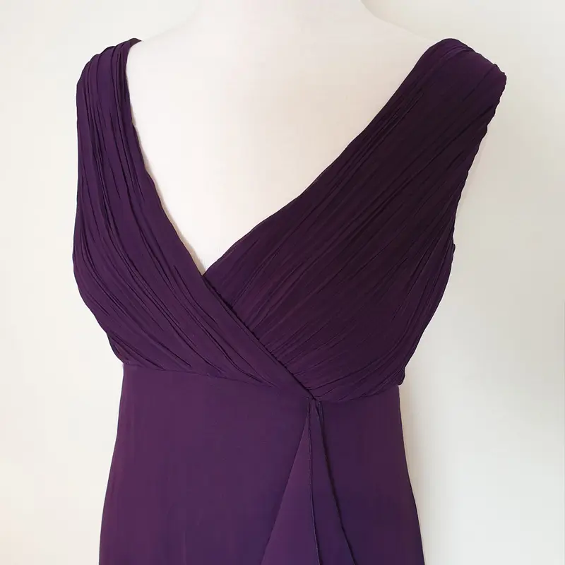 Gorgeous long purple gown featuring a cross over pleated bust and a front drape. This style is very flattering. It’s made from a quality chiffon which flows beautifully. This evening dress works beautifully with a brooch for an extra touch of glamour to enhance the drape. Perfect for any special occasion. Hurry last one!