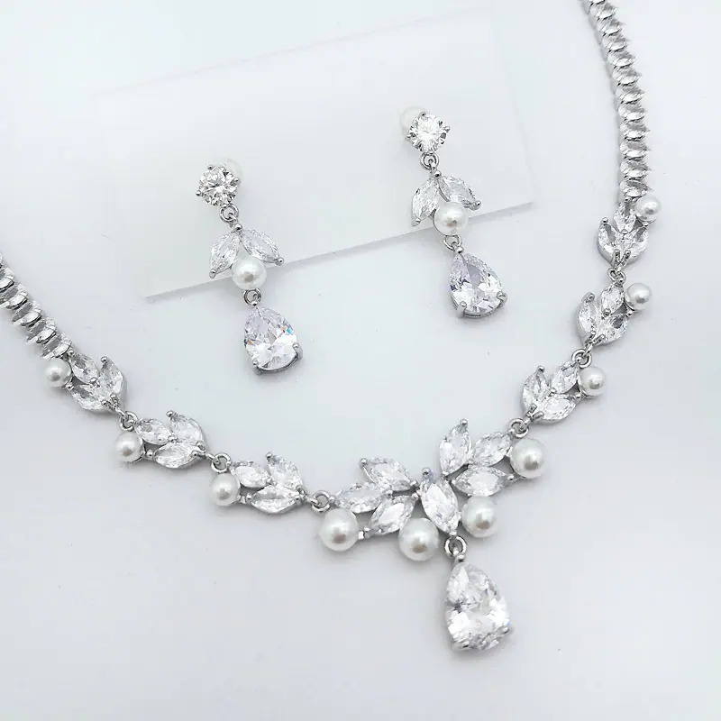 This beautiful silver pearl necklace set is a more embellished version of our ‘Juliana necklace set’ with a small tear drop shaped cubic zirconia on repeat the whole way round adding extra luxury to the neckline. Made from high grade cubic zirconia and quality faux pearls on a rhodium silver plated setting.