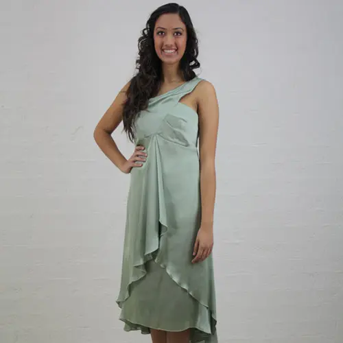 Elegantly draped cocktail dress with a single strap. This dress is simply stunning. It’s very versatile for all special occasions. Made from quality mushroom coloured chiffon or green georgette.