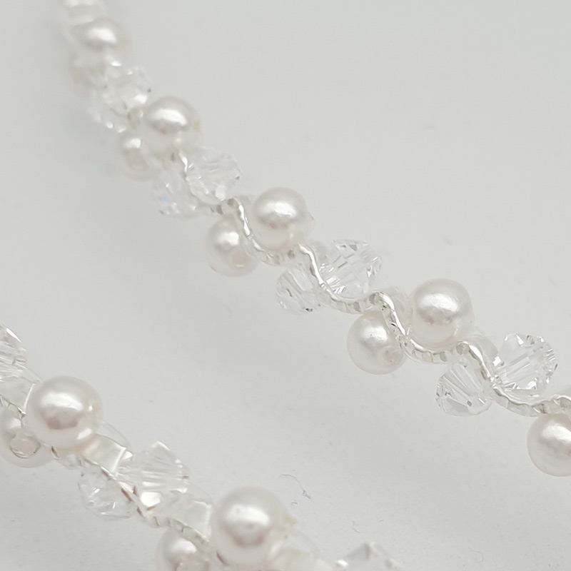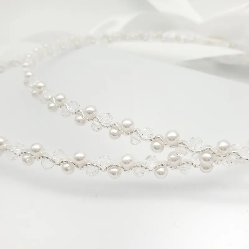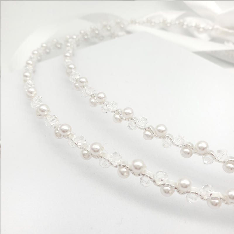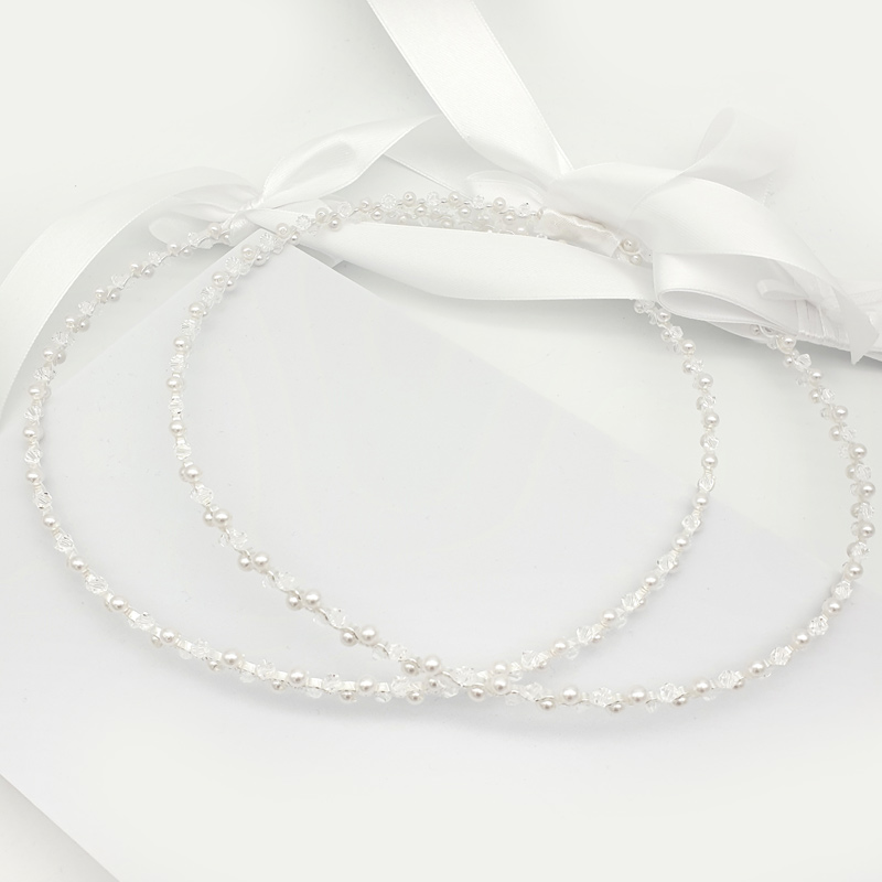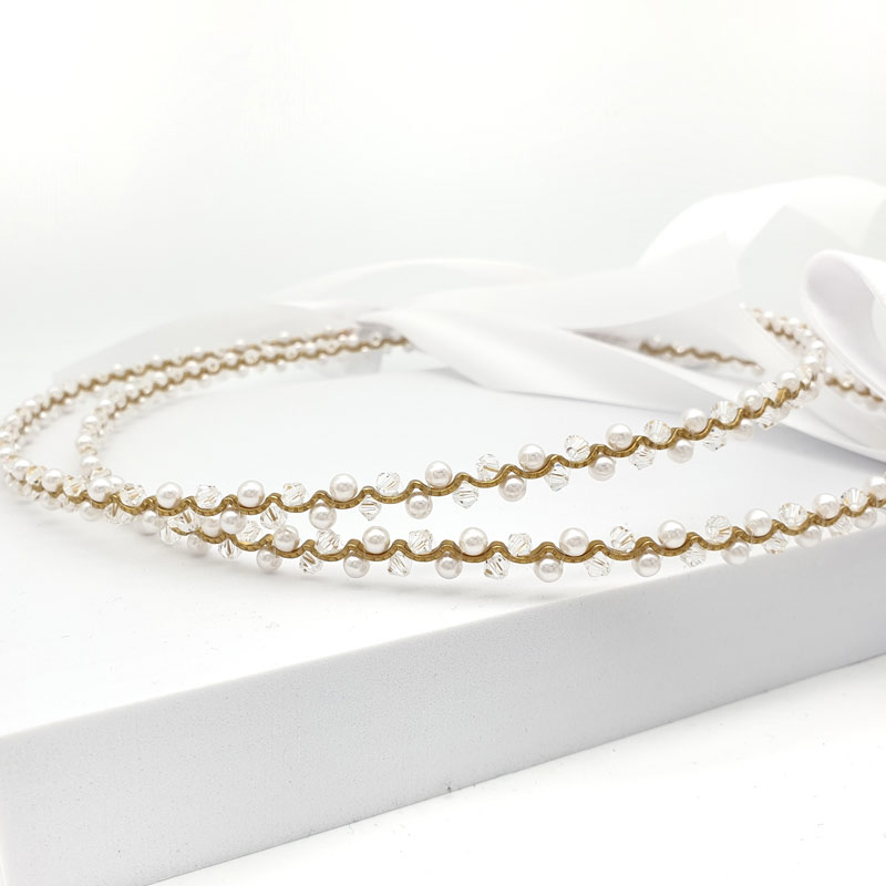 Intricately crafted gorgeous authentic handmade Greek stefana. This beautiful wedding stefana is made with a fine wavy wire and adorned with Swarovski crystals and white glass pearls. Sold as a 2 piece set and attached together with white satin ribbon. Available in silver or gold.
