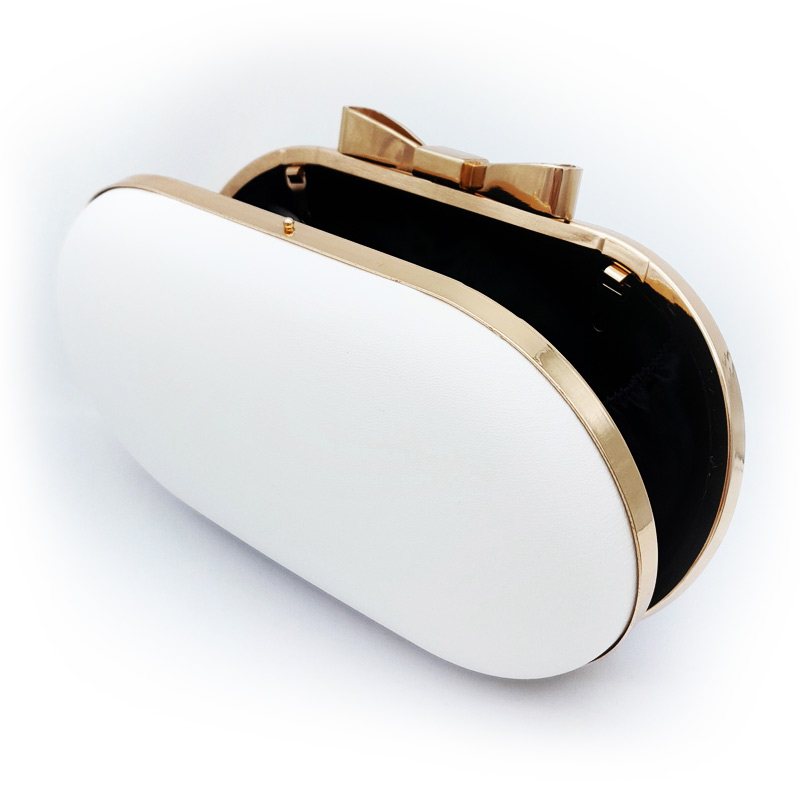 White bridal clutch with stylish gold bow clasp versatile for any special occasion. Covered in white PU and lined with black satin. Also featuring 2 attachable gold chains one can be used to carry over your shoulder and the other to carry over your arm or simply hold for your convenience.