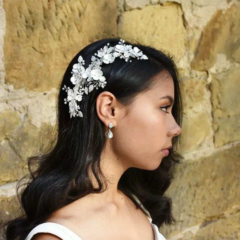 A stunning headpiece with a mix of small flowers and fine leaves. Adorned with bunches of crystal beads and just a few tiny sparkles. It’s a soft flexible lightweight piece available in 3 finishes – soft white on silver, soft white on gold and soft white on pale rose gold. It has a strong clip fitting and the piece is very easily shaped.
